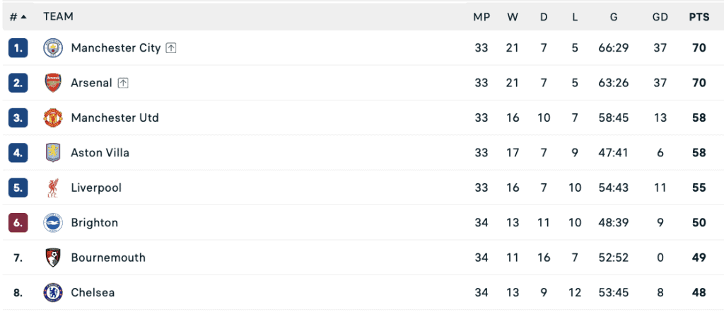ورغم التساوي في عدد النقاط، يتفوق مانشستر سيتي على الفريق اللندني في عدد الأهداف المسجلة، بعدما وصل إلى 66 هدفا مقابل 63 لأرسنال، مع تساوي الفريقين في فارق الأهداف عند زائد 37.