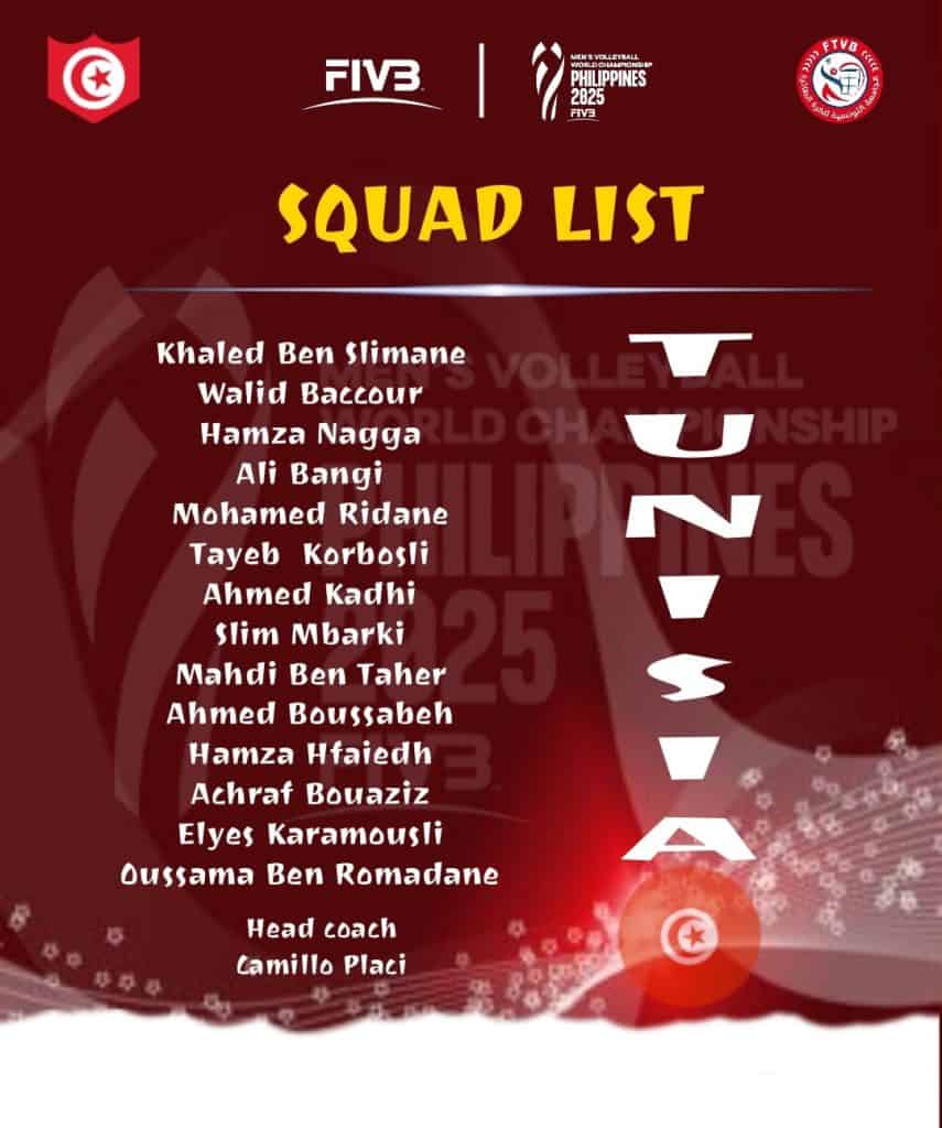 L’Université tunisienne de volley-ball a annoncé la liste définitive des joueurs convoqués pour participer au Championnat du monde senior de volley-ball 2025, qui se déroulera aux Philippines du 12 au 28 septembre 2025. Les Aigles de Carthage, dirigés par l’entraîneur italien Camillo Blachevi, aspirent à obtenir des résultats positifs lors de cet événement mondial.
